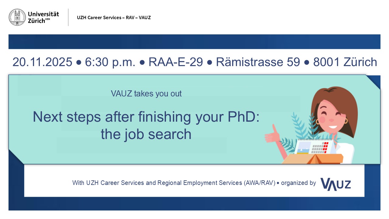 Finding a new job is always a challenge and can be daunting. The UZH Career Services introduces you to strategies and methods for career planning and the job search. And in case the transition becomes a bit more difficult, the regional employment services (AWA/RAV) experts will give you tips on how to proceed. Including an Apéro for a more informal exchange.